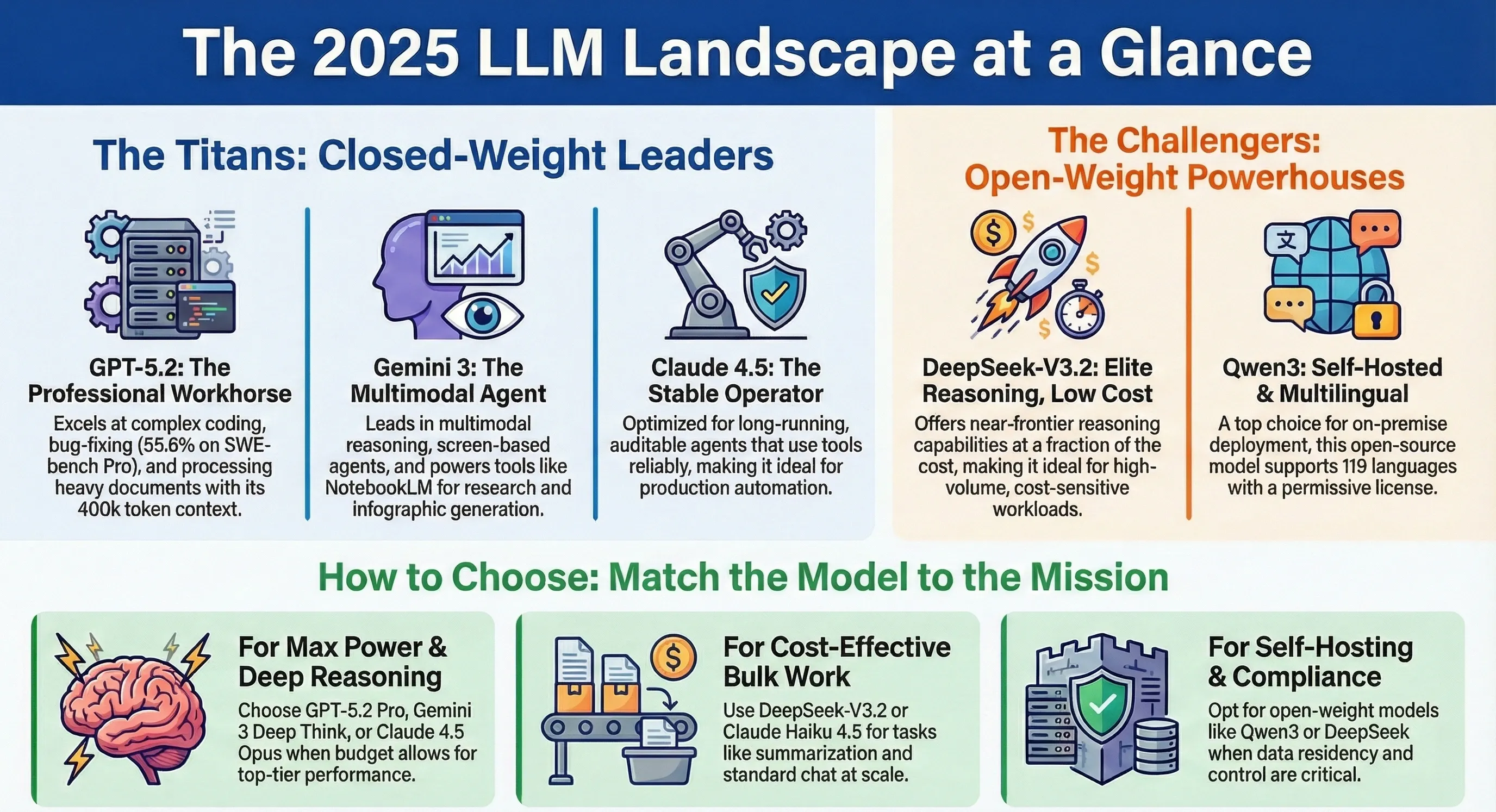 By the end of 2025, the LLM landscape looks almost complete. You have frontier models like GPT‑5.2, Gemini 3 Pro, Claude 4.5 Sonnet and Opus, aggressively priced challengers like DeepSeek V3.2, and open families such as Qwen3. Multimodal capabilities, ultra‑long context, and “thinking” modes are no longer headlines — they are the default.